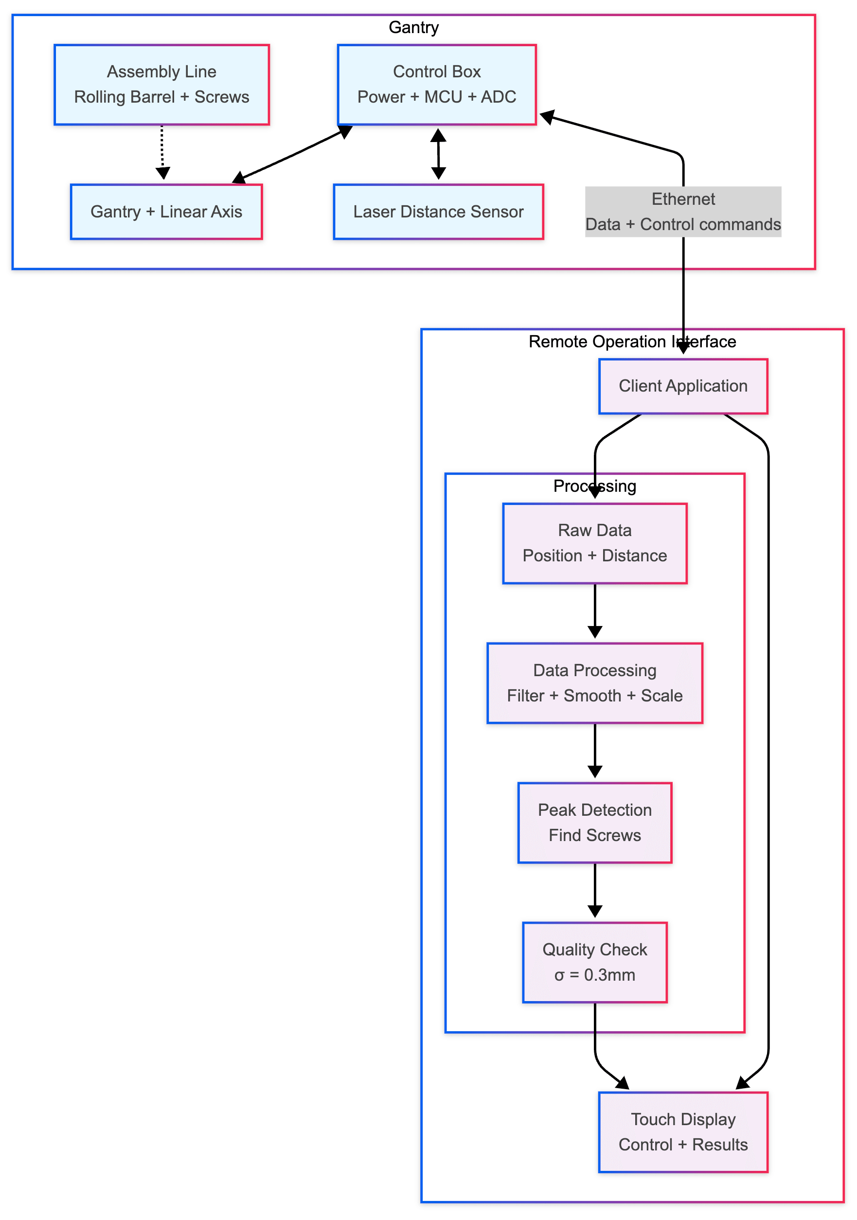 When screws move through the assembly line, a gantry system activates and sweeps its laser sensor across each row, measuring distances while tracking position to create a detailed surface profile. The control system collects this data and streams it to the operator interface, where software algorithms clean the measurements, remove noise, and convert readings to physical dimensions.